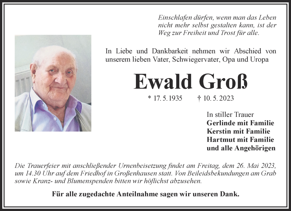 Hier finden Sie alle Traueranzeigen aus der Zeitung, die bisher für Ewald Groß erschienen sind. Weitere Traueranzeigen, die in der Zeitung erscheinen, werden hier ebenfalls aufgelistet