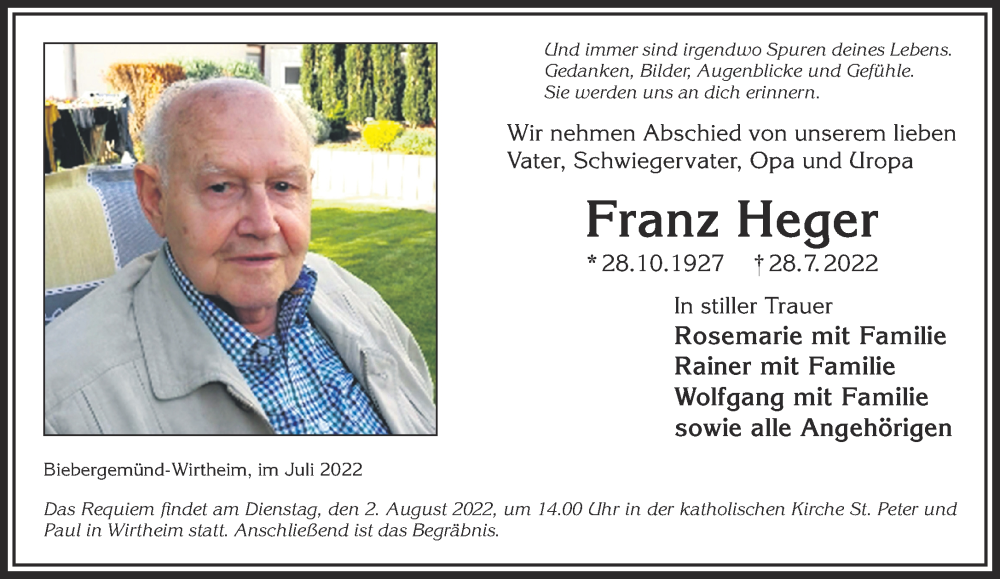 Hier finden Sie alle Traueranzeigen aus der Zeitung, die bisher für Franz Heger erschienen sind. Weitere Traueranzeigen, die in der Zeitung erscheinen, werden hier ebenfalls aufgelistet