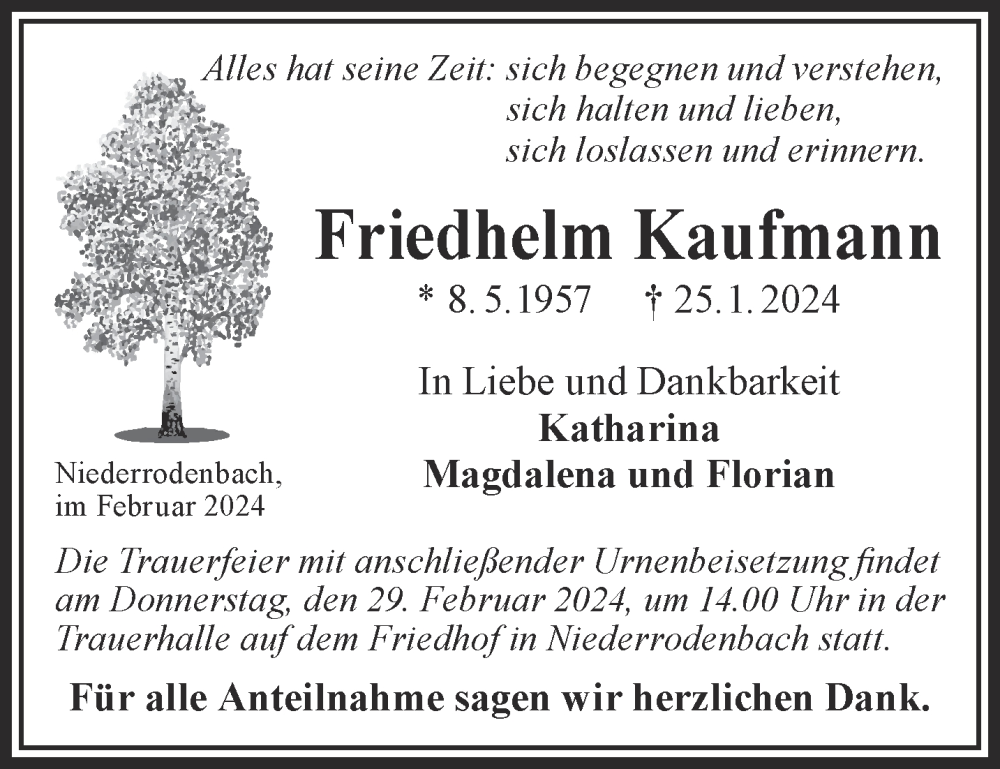 Hier finden Sie alle Traueranzeigen aus der Zeitung, die bisher für Friedhelm Kaufmann erschienen sind. Weitere Traueranzeigen, die in der Zeitung erscheinen, werden hier ebenfalls aufgelistet