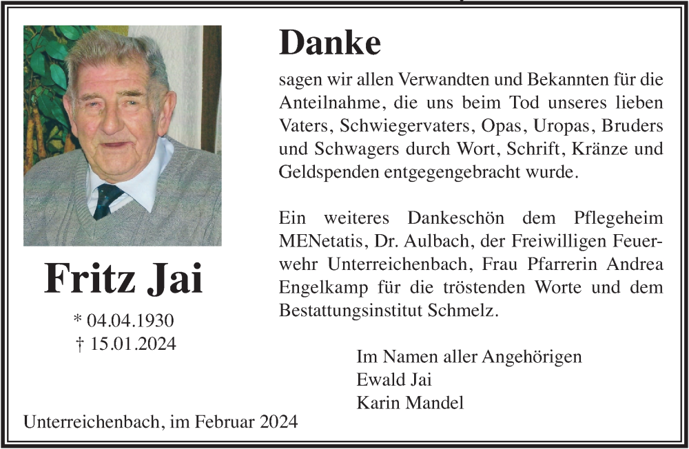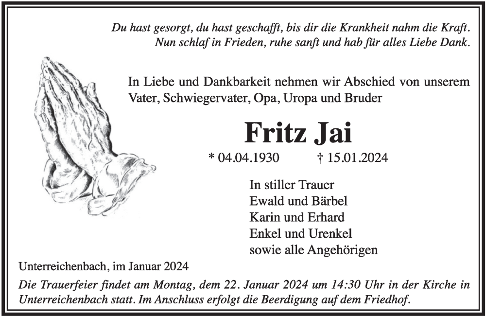 Hier finden Sie alle Traueranzeigen aus der Zeitung, die bisher für Fritz Jai erschienen sind. Weitere Traueranzeigen, die in der Zeitung erscheinen, werden hier ebenfalls aufgelistet