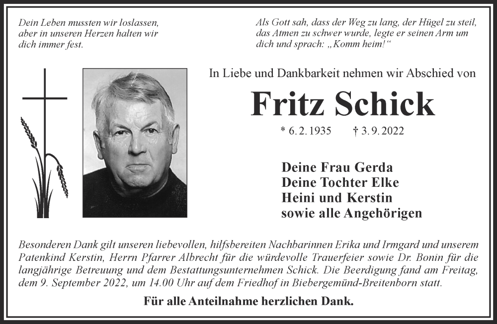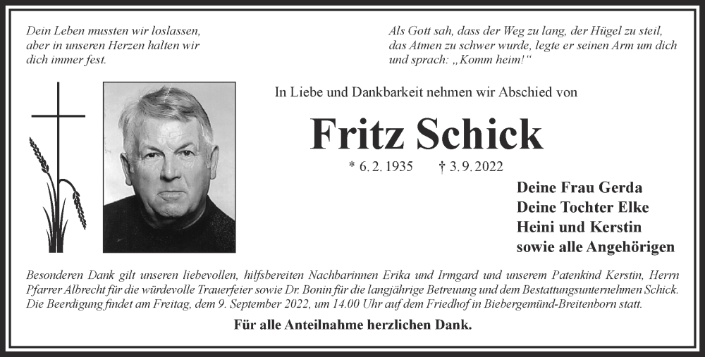 Hier finden Sie alle Traueranzeigen aus der Zeitung, die bisher für Fritz Schick erschienen sind. Weitere Traueranzeigen, die in der Zeitung erscheinen, werden hier ebenfalls aufgelistet