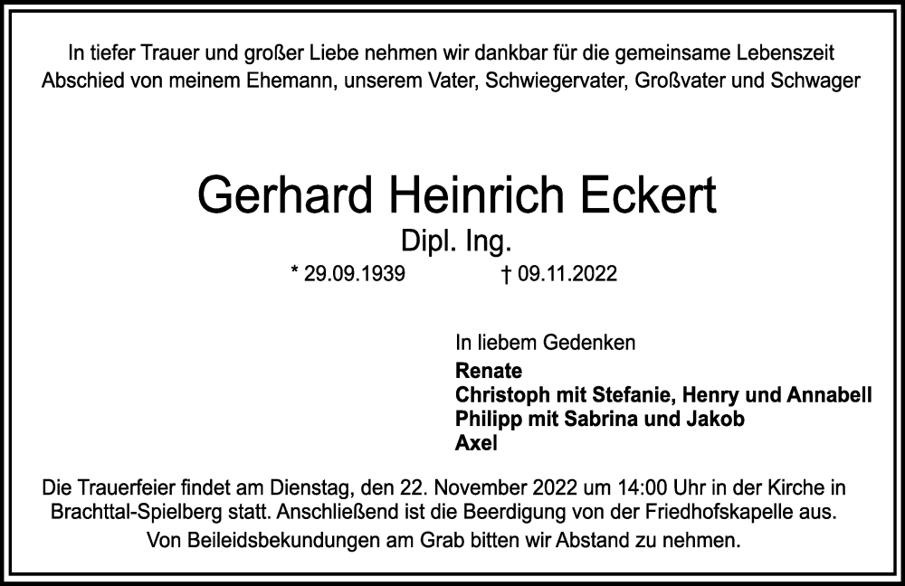 Hier finden Sie alle Traueranzeigen aus der Zeitung, die bisher für Gerhard Heinrich Eckert erschienen sind. Weitere Traueranzeigen, die in der Zeitung erscheinen, werden hier ebenfalls aufgelistet