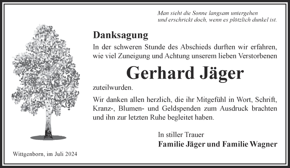 Hier finden Sie alle Traueranzeigen aus der Zeitung, die bisher für Gerhard Jäger erschienen sind. Weitere Traueranzeigen, die in der Zeitung erscheinen, werden hier ebenfalls aufgelistet