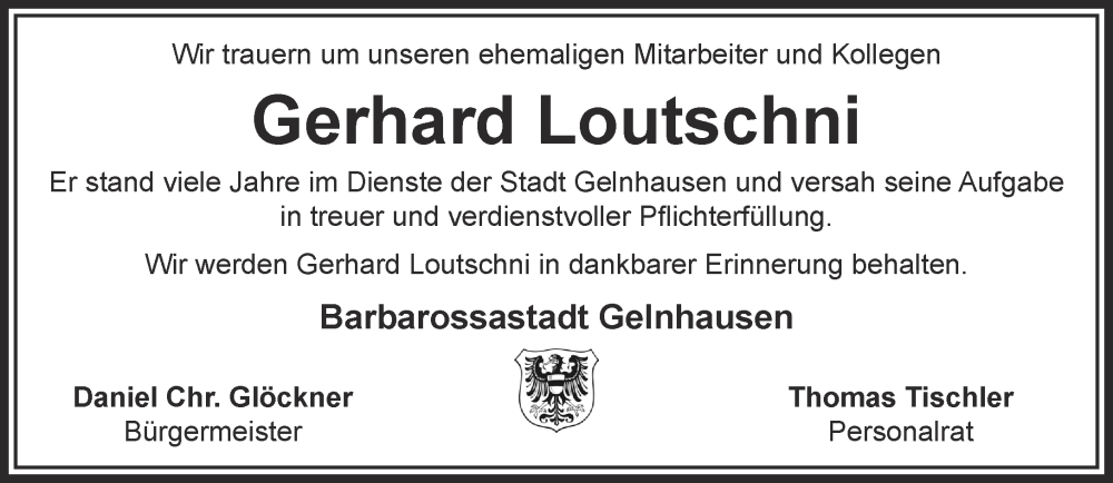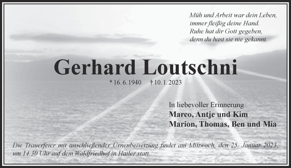 Hier finden Sie alle Traueranzeigen aus der Zeitung, die bisher für Gerhard Loutschni erschienen sind. Weitere Traueranzeigen, die in der Zeitung erscheinen, werden hier ebenfalls aufgelistet