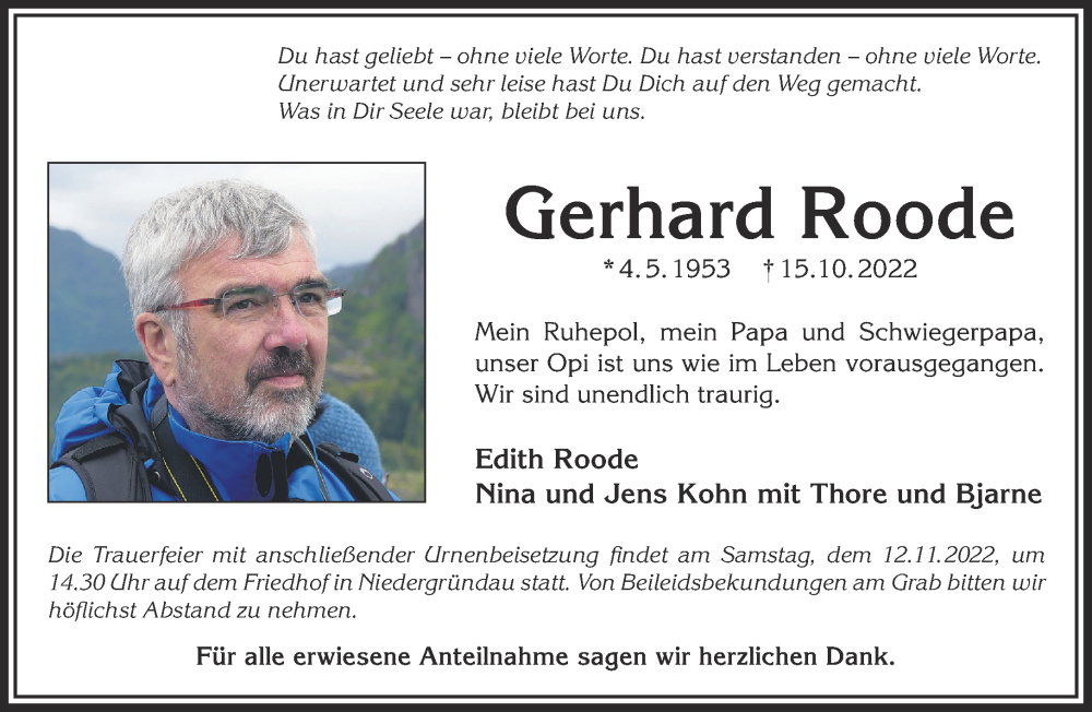 Hier finden Sie alle Traueranzeigen aus der Zeitung, die bisher für Gerhard Roode erschienen sind. Weitere Traueranzeigen, die in der Zeitung erscheinen, werden hier ebenfalls aufgelistet