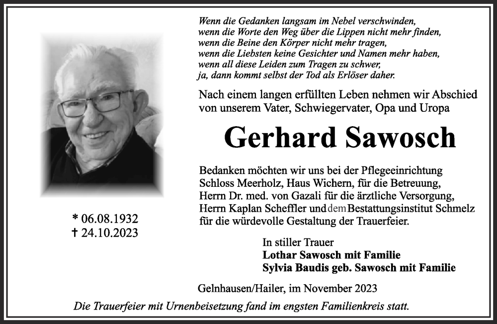 Hier finden Sie alle Traueranzeigen aus der Zeitung, die bisher für Gerhard Sawosch erschienen sind. Weitere Traueranzeigen, die in der Zeitung erscheinen, werden hier ebenfalls aufgelistet