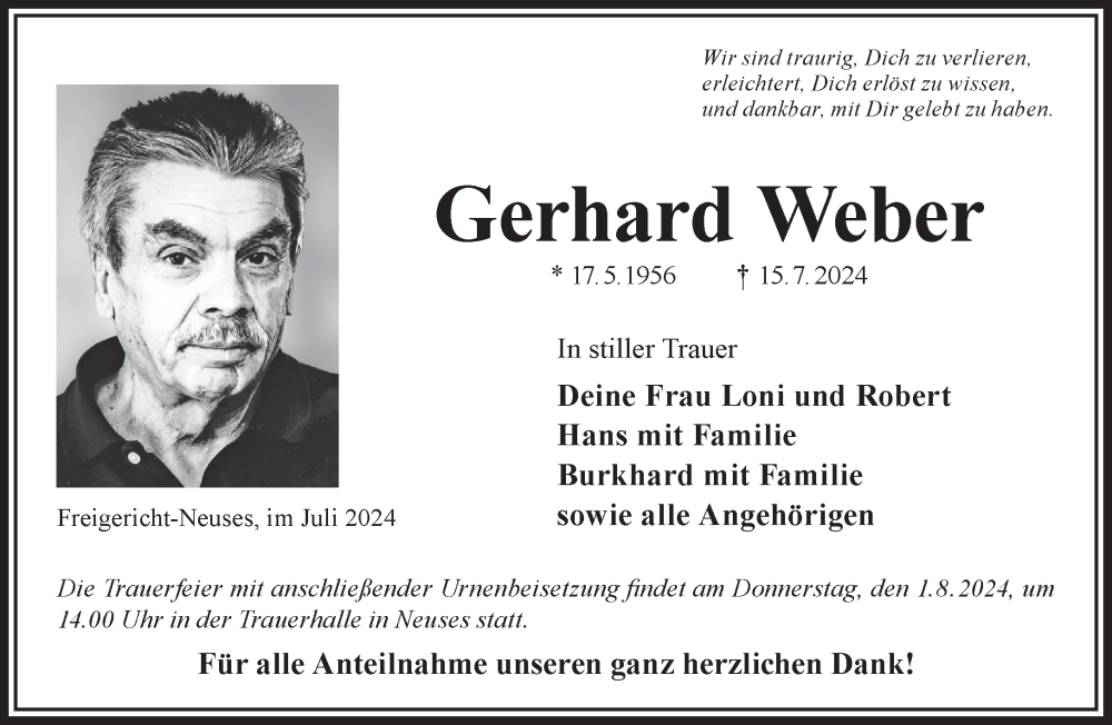 Hier finden Sie alle Traueranzeigen aus der Zeitung, die bisher für Gerhard Weber erschienen sind. Weitere Traueranzeigen, die in der Zeitung erscheinen, werden hier ebenfalls aufgelistet