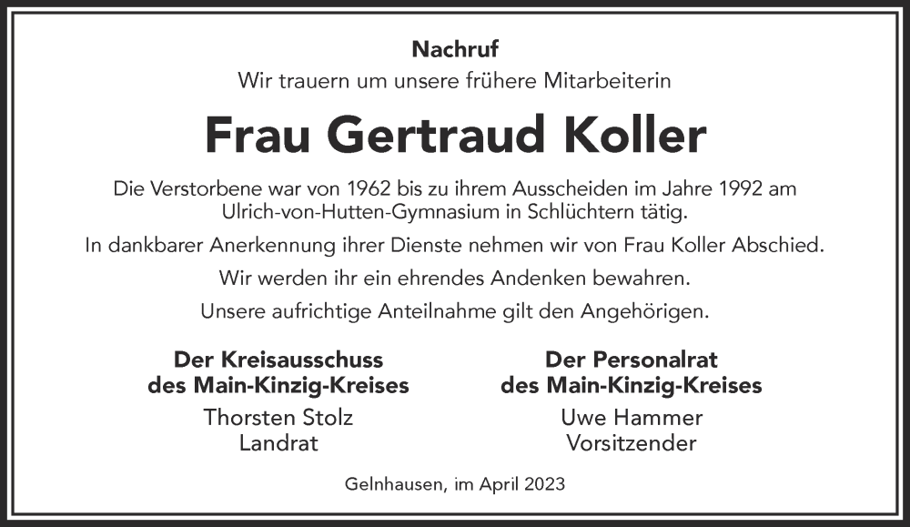 Hier finden Sie alle Traueranzeigen aus der Zeitung, die bisher für Gertraud Koller erschienen sind. Weitere Traueranzeigen, die in der Zeitung erscheinen, werden hier ebenfalls aufgelistet