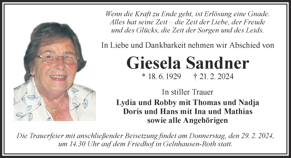 Hier finden Sie alle Traueranzeigen aus der Zeitung, die bisher für Giesela Sandner erschienen sind. Weitere Traueranzeigen, die in der Zeitung erscheinen, werden hier ebenfalls aufgelistet