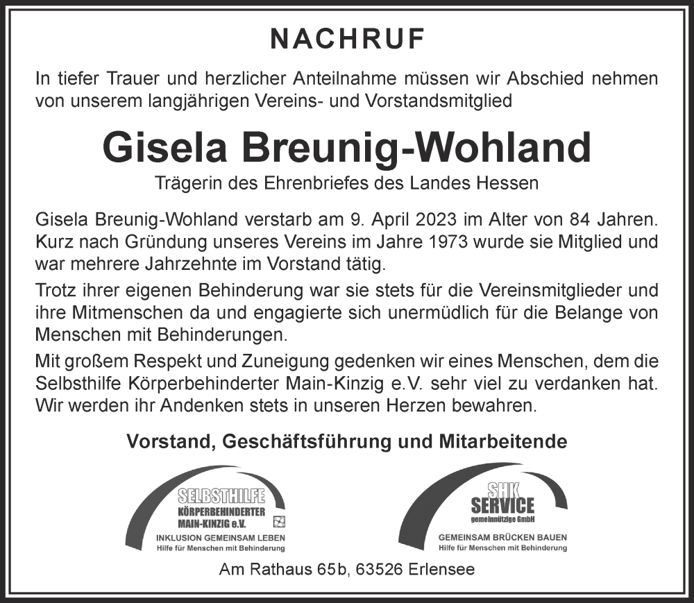 Hier finden Sie alle Traueranzeigen aus der Zeitung, die bisher für Gisela Breunig-Wohland erschienen sind. Weitere Traueranzeigen, die in der Zeitung erscheinen, werden hier ebenfalls aufgelistet
