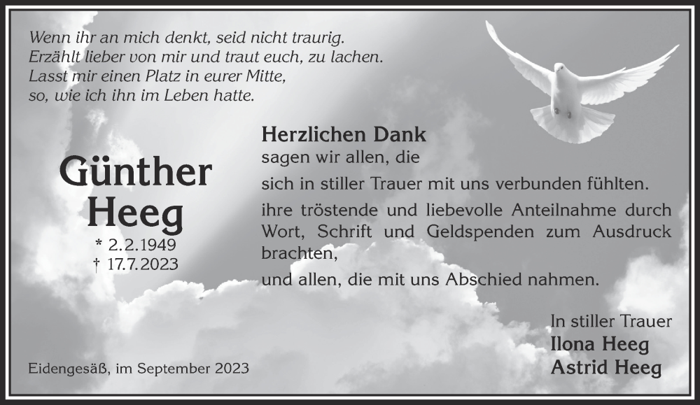Hier finden Sie alle Traueranzeigen aus der Zeitung, die bisher für Günther Heeg erschienen sind. Weitere Traueranzeigen, die in der Zeitung erscheinen, werden hier ebenfalls aufgelistet