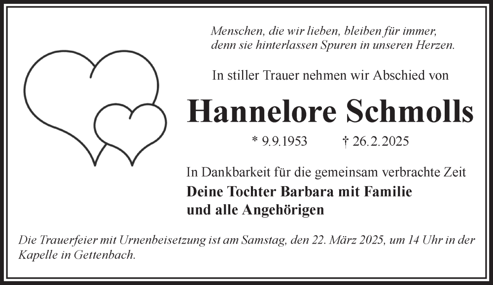 Hier finden Sie alle Traueranzeigen aus der Zeitung, die bisher für Hannelore Schmolls erschienen sind. Weitere Traueranzeigen, die in der Zeitung erscheinen, werden hier ebenfalls aufgelistet