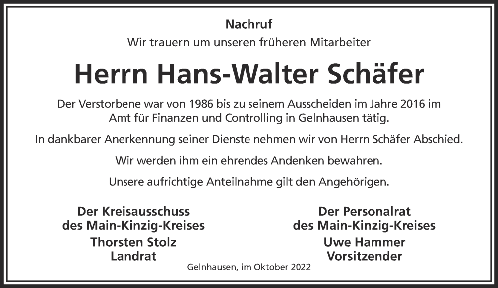 Hier finden Sie alle Traueranzeigen aus der Zeitung, die bisher für Hans-Walter Schäfer erschienen sind. Weitere Traueranzeigen, die in der Zeitung erscheinen, werden hier ebenfalls aufgelistet
