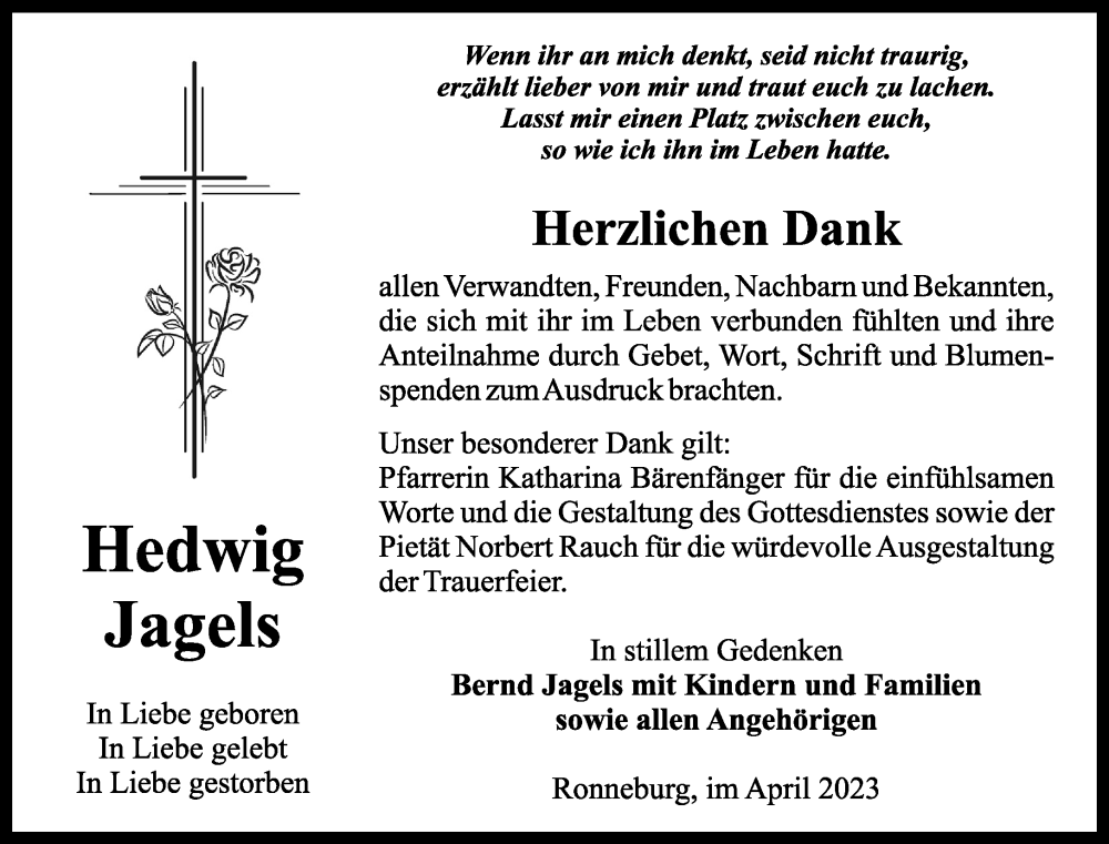 Hier finden Sie alle Traueranzeigen aus der Zeitung, die bisher für Hedwig Jagels erschienen sind. Weitere Traueranzeigen, die in der Zeitung erscheinen, werden hier ebenfalls aufgelistet