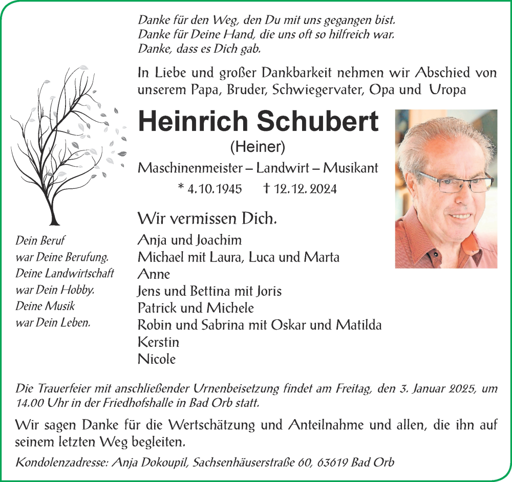 Hier finden Sie alle Traueranzeigen aus der Zeitung, die bisher für Heinrich Schubert erschienen sind. Weitere Traueranzeigen, die in der Zeitung erscheinen, werden hier ebenfalls aufgelistet