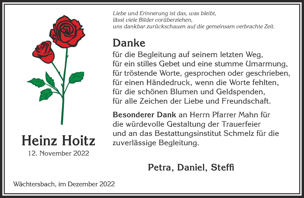 Hier finden Sie alle Traueranzeigen aus der Zeitung, die bisher für Heinz Hoitz erschienen sind. Weitere Traueranzeigen, die in der Zeitung erscheinen, werden hier ebenfalls aufgelistet