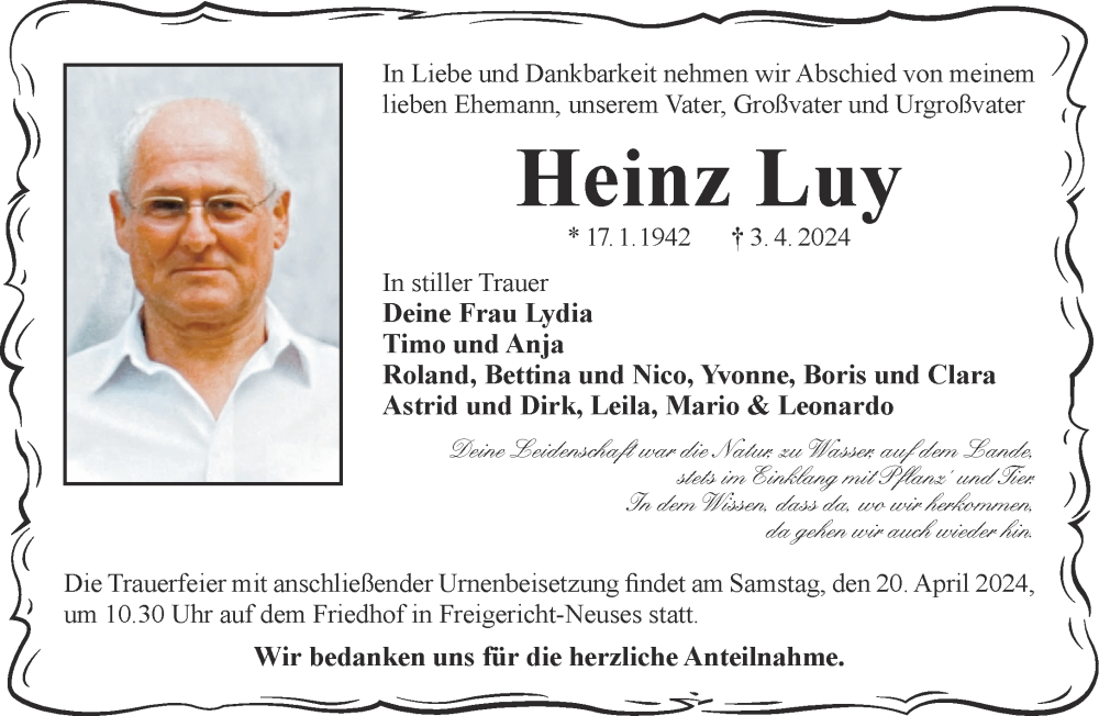 Hier finden Sie alle Traueranzeigen aus der Zeitung, die bisher für Heinz Luy erschienen sind. Weitere Traueranzeigen, die in der Zeitung erscheinen, werden hier ebenfalls aufgelistet