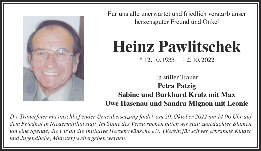 Hier finden Sie alle Traueranzeigen aus der Zeitung, die bisher für Heinz Pawlitschek erschienen sind. Weitere Traueranzeigen, die in der Zeitung erscheinen, werden hier ebenfalls aufgelistet