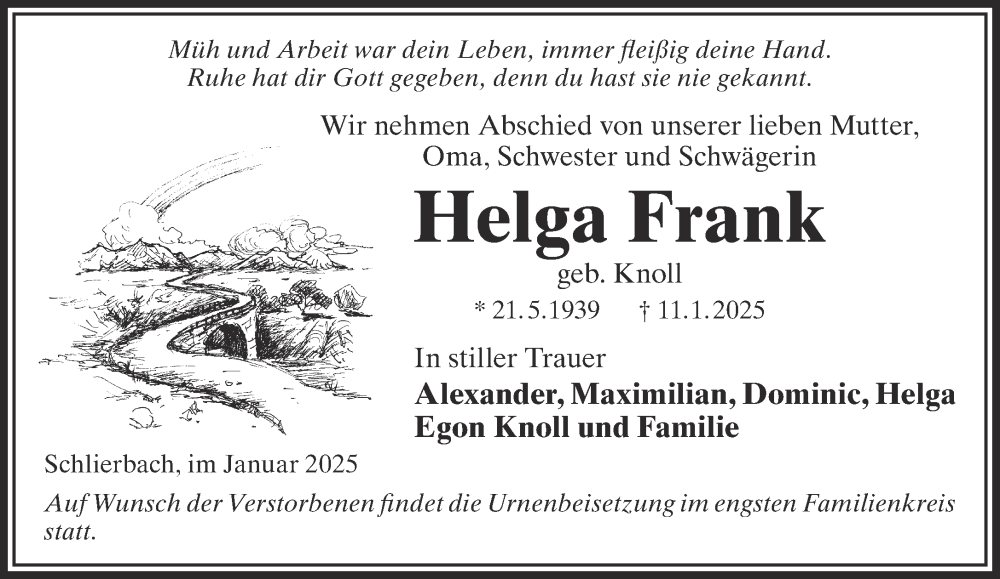 Hier finden Sie alle Traueranzeigen aus der Zeitung, die bisher für Helga Frank erschienen sind. Weitere Traueranzeigen, die in der Zeitung erscheinen, werden hier ebenfalls aufgelistet