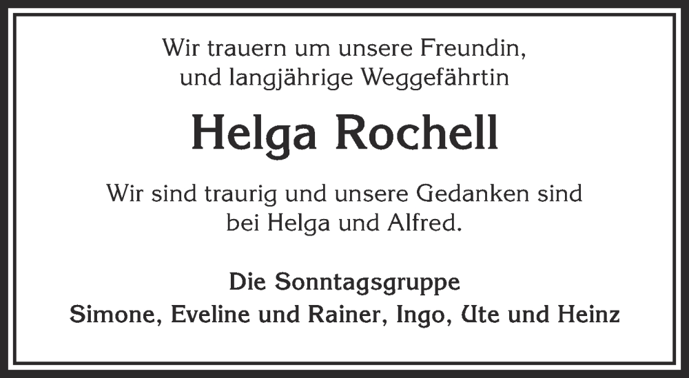 Hier finden Sie alle Traueranzeigen aus der Zeitung, die bisher für Helga Rochell erschienen sind. Weitere Traueranzeigen, die in der Zeitung erscheinen, werden hier ebenfalls aufgelistet