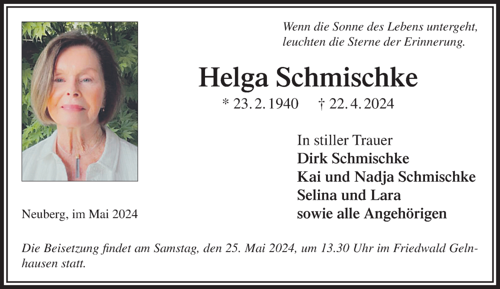 Hier finden Sie alle Traueranzeigen aus der Zeitung, die bisher für Helga Schmischke erschienen sind. Weitere Traueranzeigen, die in der Zeitung erscheinen, werden hier ebenfalls aufgelistet