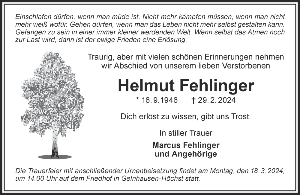 Hier finden Sie alle Traueranzeigen aus der Zeitung, die bisher für Helmut Fehlinger erschienen sind. Weitere Traueranzeigen, die in der Zeitung erscheinen, werden hier ebenfalls aufgelistet
