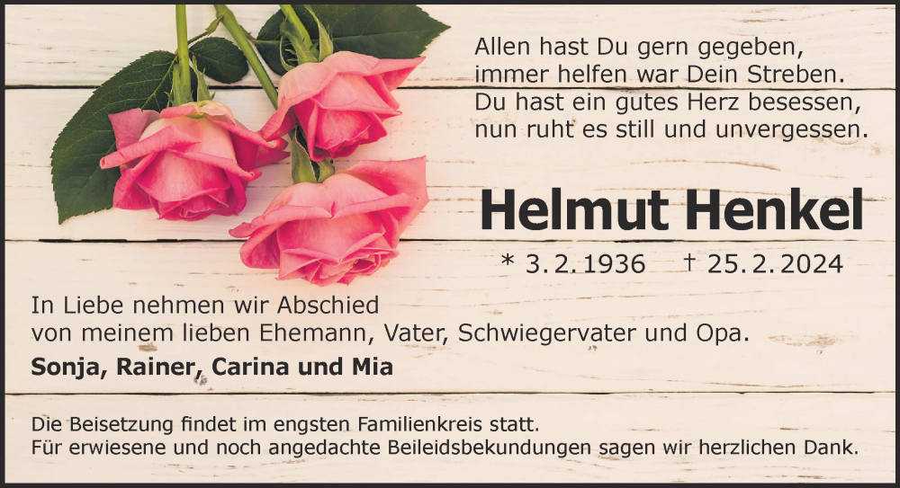 Hier finden Sie alle Traueranzeigen aus der Zeitung, die bisher für Helmut Henkel erschienen sind. Weitere Traueranzeigen, die in der Zeitung erscheinen, werden hier ebenfalls aufgelistet