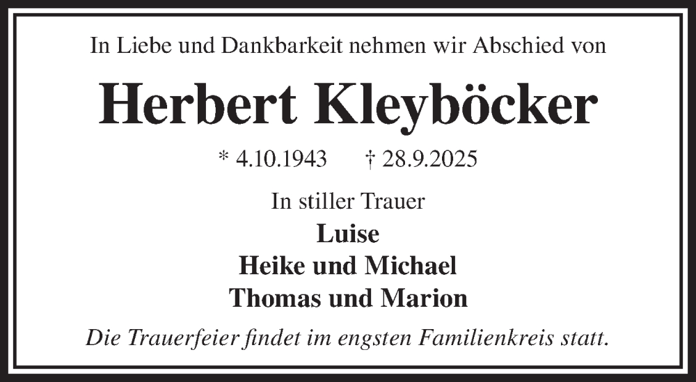 Hier finden Sie alle Traueranzeigen aus der Zeitung, die bisher für Herbert Kleyböcker erschienen sind. Weitere Traueranzeigen, die in der Zeitung erscheinen, werden hier ebenfalls aufgelistet