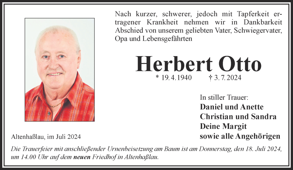 Hier finden Sie alle Traueranzeigen aus der Zeitung, die bisher für Herbert Otto erschienen sind. Weitere Traueranzeigen, die in der Zeitung erscheinen, werden hier ebenfalls aufgelistet