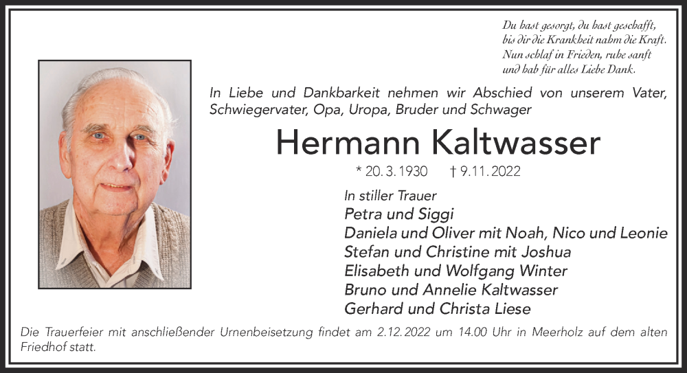 Hier finden Sie alle Traueranzeigen aus der Zeitung, die bisher für Hermann Kaltwasser erschienen sind. Weitere Traueranzeigen, die in der Zeitung erscheinen, werden hier ebenfalls aufgelistet