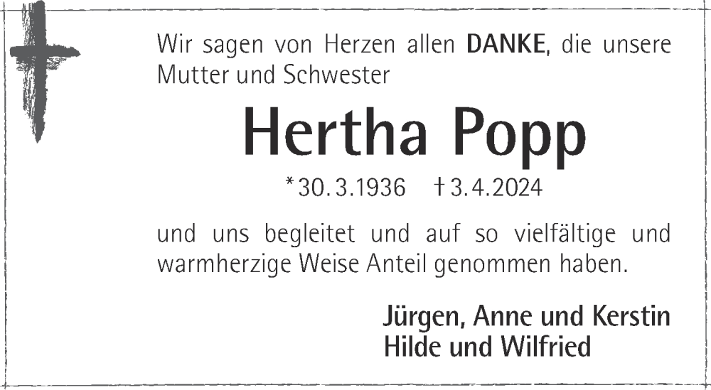 Hier finden Sie alle Traueranzeigen aus der Zeitung, die bisher für Hertha Popp erschienen sind. Weitere Traueranzeigen, die in der Zeitung erscheinen, werden hier ebenfalls aufgelistet