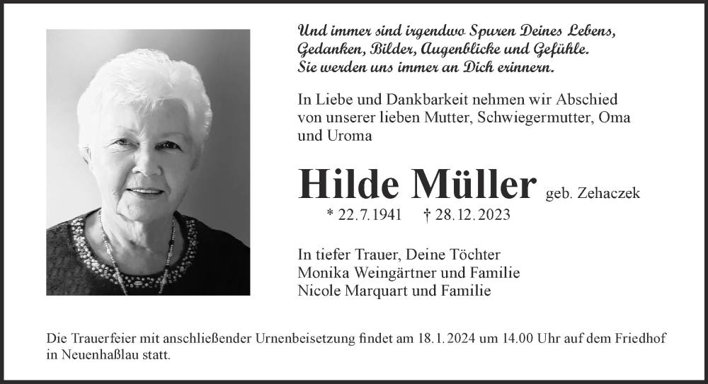 Hier finden Sie alle Traueranzeigen aus der Zeitung, die bisher für Hilde Müller erschienen sind. Weitere Traueranzeigen, die in der Zeitung erscheinen, werden hier ebenfalls aufgelistet
