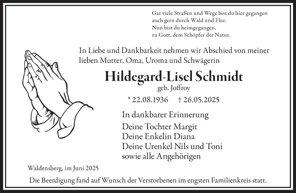 Hier finden Sie alle Traueranzeigen aus der Zeitung, die bisher für Hildegard-Lisel Schmidt erschienen sind. Weitere Traueranzeigen, die in der Zeitung erscheinen, werden hier ebenfalls aufgelistet