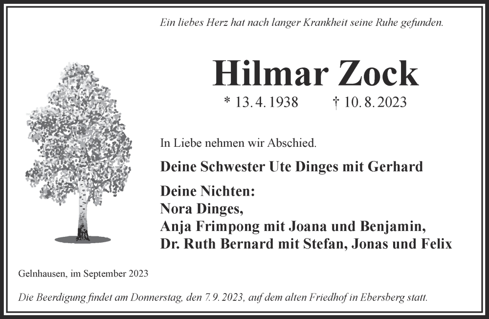 Hier finden Sie alle Traueranzeigen aus der Zeitung, die bisher für Hilmar Zock erschienen sind. Weitere Traueranzeigen, die in der Zeitung erscheinen, werden hier ebenfalls aufgelistet