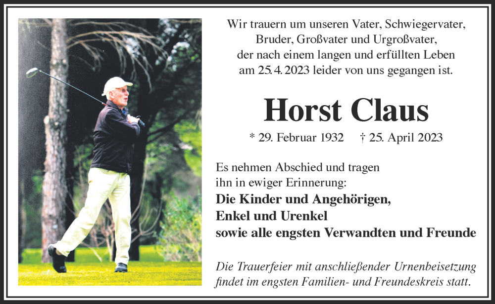 Hier finden Sie alle Traueranzeigen aus der Zeitung, die bisher für Horst Claus erschienen sind. Weitere Traueranzeigen, die in der Zeitung erscheinen, werden hier ebenfalls aufgelistet