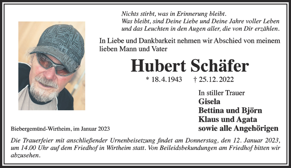 Hier finden Sie alle Traueranzeigen aus der Zeitung, die bisher für Hubert Schäfer erschienen sind. Weitere Traueranzeigen, die in der Zeitung erscheinen, werden hier ebenfalls aufgelistet