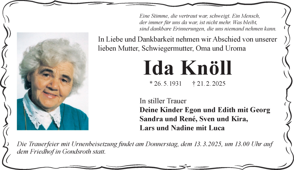 Hier finden Sie alle Traueranzeigen aus der Zeitung, die bisher für Ida Knöll erschienen sind. Weitere Traueranzeigen, die in der Zeitung erscheinen, werden hier ebenfalls aufgelistet