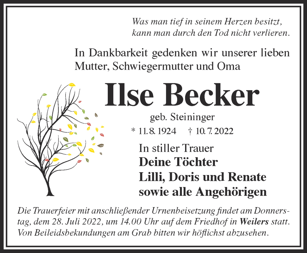 Hier finden Sie alle Traueranzeigen aus der Zeitung, die bisher für Ilse Becker erschienen sind. Weitere Traueranzeigen, die in der Zeitung erscheinen, werden hier ebenfalls aufgelistet