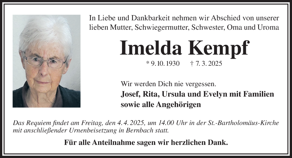 Hier finden Sie alle Traueranzeigen aus der Zeitung, die bisher für Imelda Kempf erschienen sind. Weitere Traueranzeigen, die in der Zeitung erscheinen, werden hier ebenfalls aufgelistet