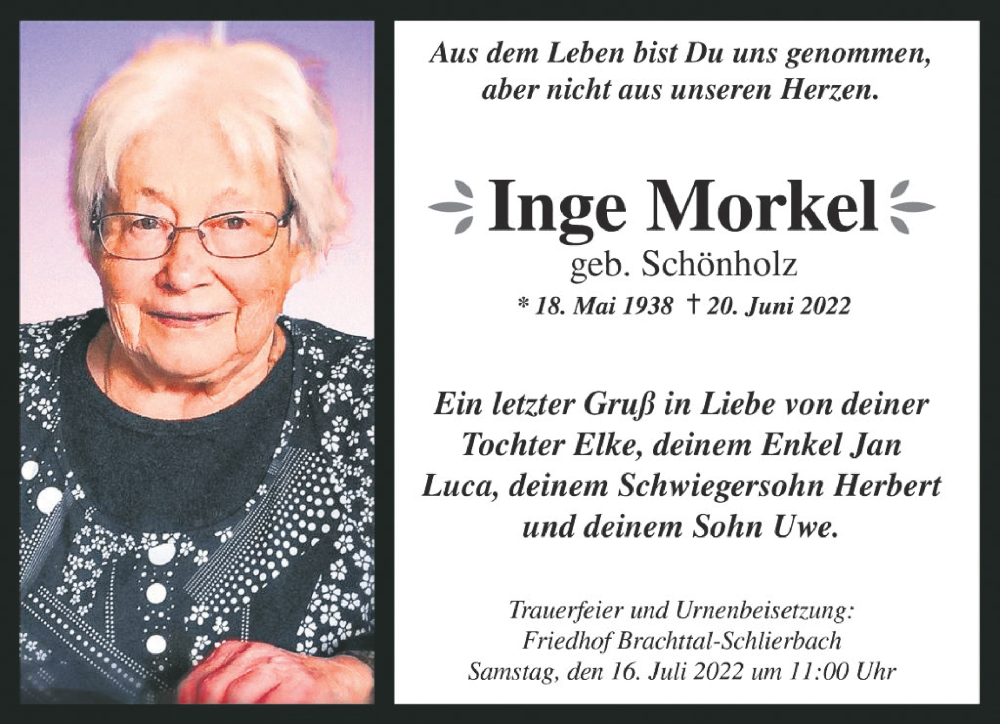 Hier finden Sie alle Traueranzeigen aus der Zeitung, die bisher für Inge Morkel erschienen sind. Weitere Traueranzeigen, die in der Zeitung erscheinen, werden hier ebenfalls aufgelistet