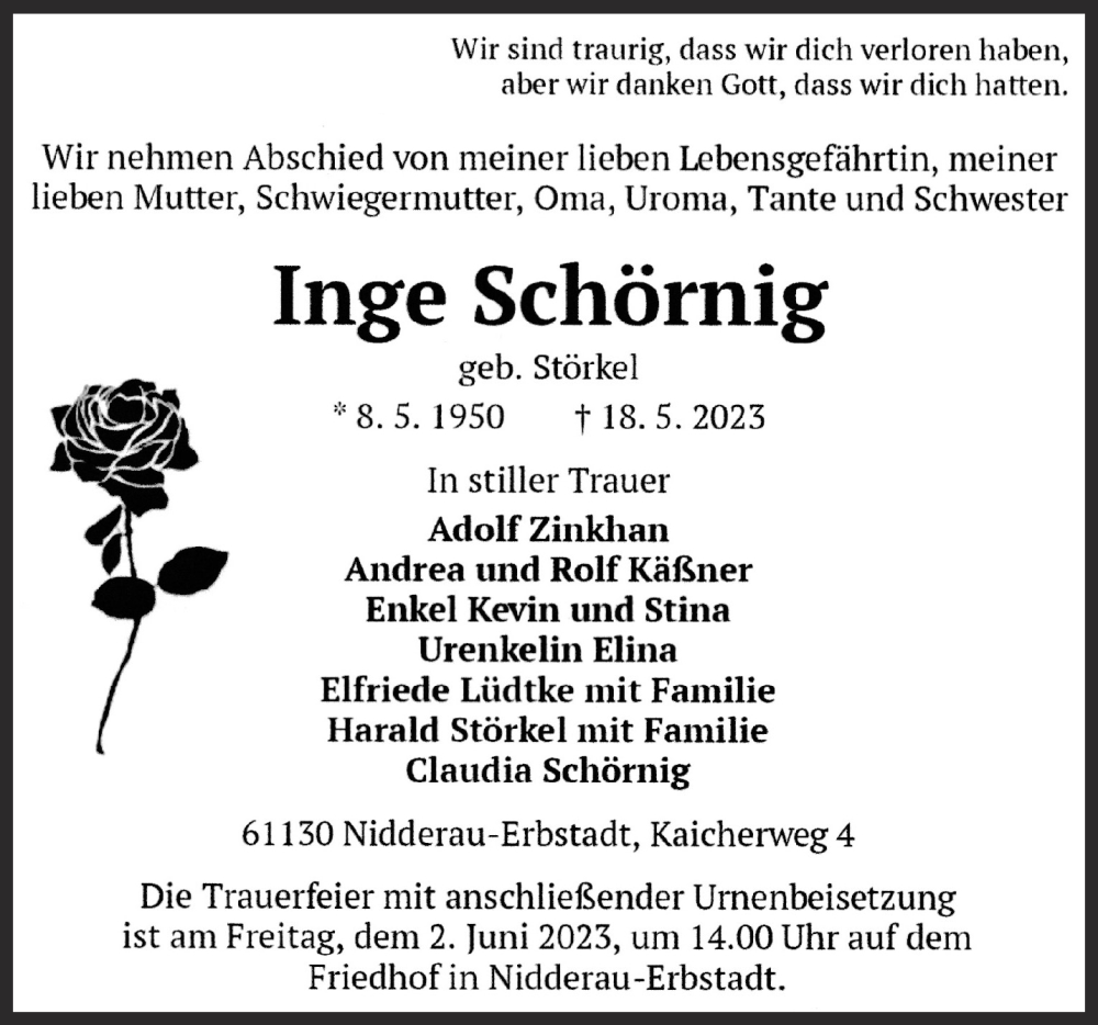 Hier finden Sie alle Traueranzeigen aus der Zeitung, die bisher für Inge Schörnig erschienen sind. Weitere Traueranzeigen, die in der Zeitung erscheinen, werden hier ebenfalls aufgelistet