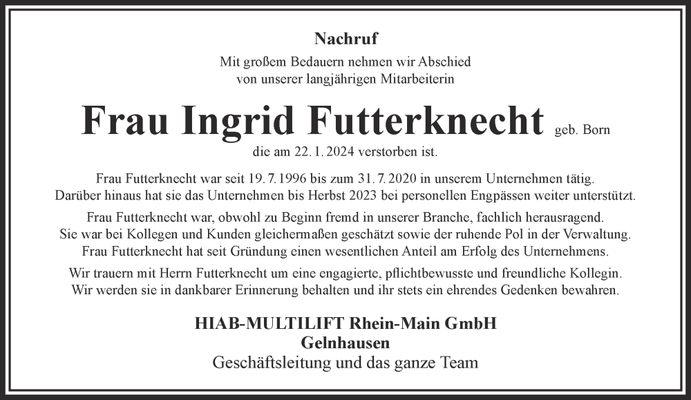 Hier finden Sie alle Traueranzeigen aus der Zeitung, die bisher für Ingrid Futterknecht erschienen sind. Weitere Traueranzeigen, die in der Zeitung erscheinen, werden hier ebenfalls aufgelistet