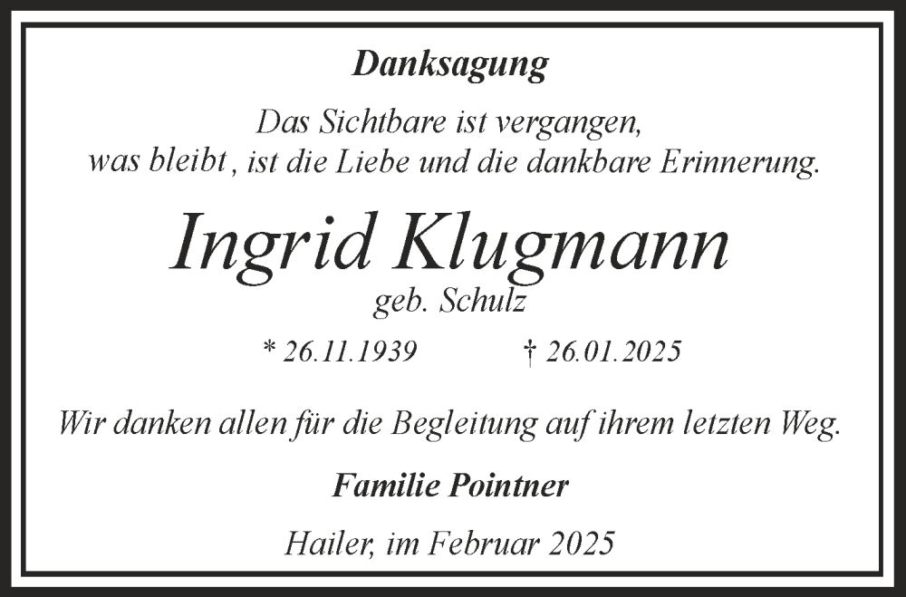 Hier finden Sie alle Traueranzeigen aus der Zeitung, die bisher für Ingrid Klugmann erschienen sind. Weitere Traueranzeigen, die in der Zeitung erscheinen, werden hier ebenfalls aufgelistet