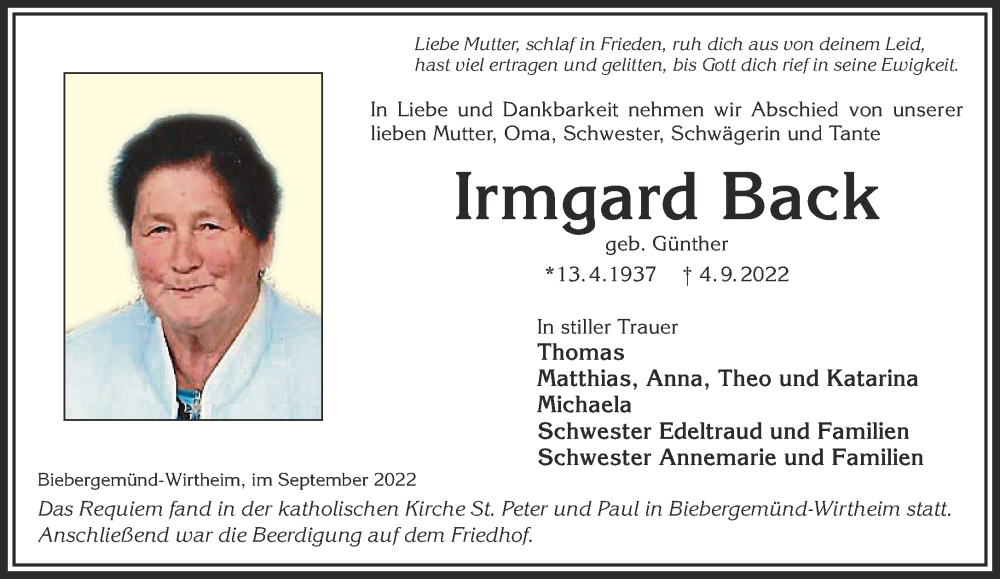 Hier finden Sie alle Traueranzeigen aus der Zeitung, die bisher für Irmgard Back erschienen sind. Weitere Traueranzeigen, die in der Zeitung erscheinen, werden hier ebenfalls aufgelistet