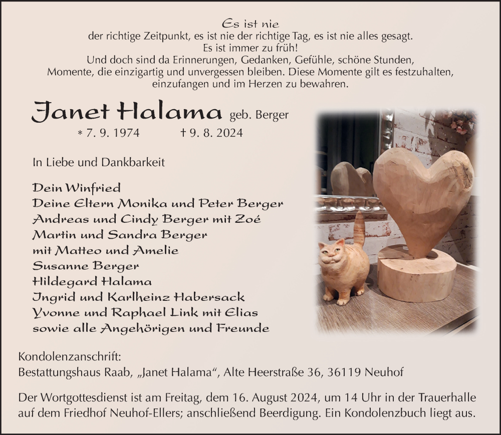 Hier finden Sie alle Traueranzeigen aus der Zeitung, die bisher für Janet Halama erschienen sind. Weitere Traueranzeigen, die in der Zeitung erscheinen, werden hier ebenfalls aufgelistet