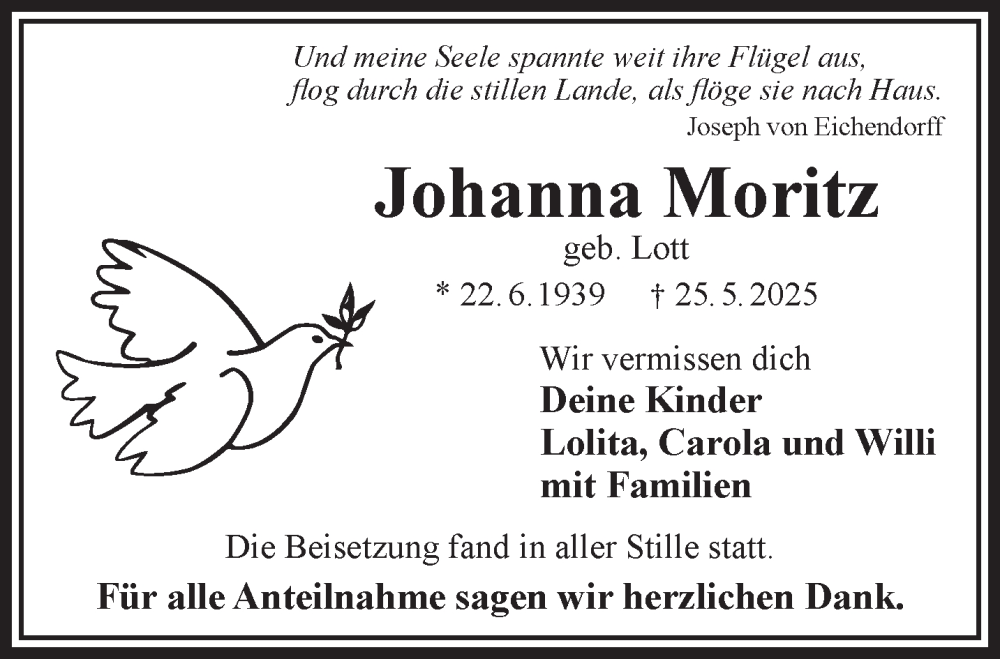 Hier finden Sie alle Traueranzeigen aus der Zeitung, die bisher für Johanna Moritz erschienen sind. Weitere Traueranzeigen, die in der Zeitung erscheinen, werden hier ebenfalls aufgelistet