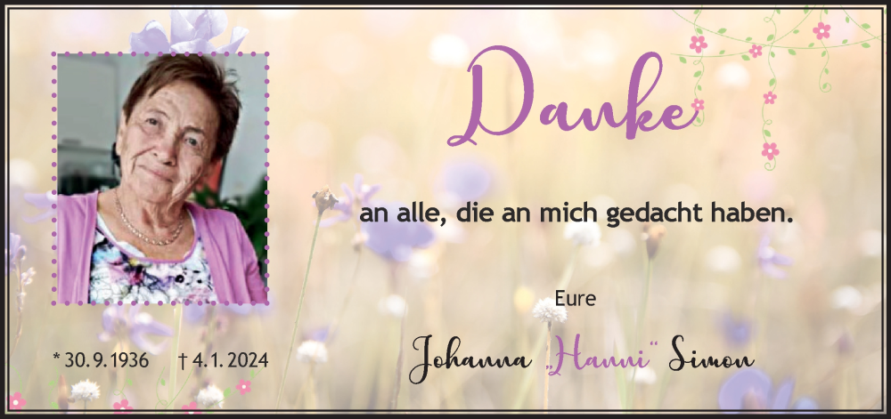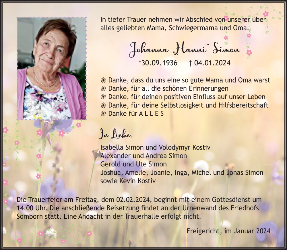 Hier finden Sie alle Traueranzeigen aus der Zeitung, die bisher für Johanna Simon erschienen sind. Weitere Traueranzeigen, die in der Zeitung erscheinen, werden hier ebenfalls aufgelistet