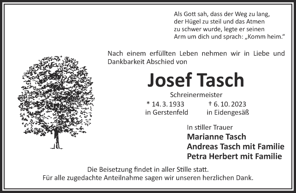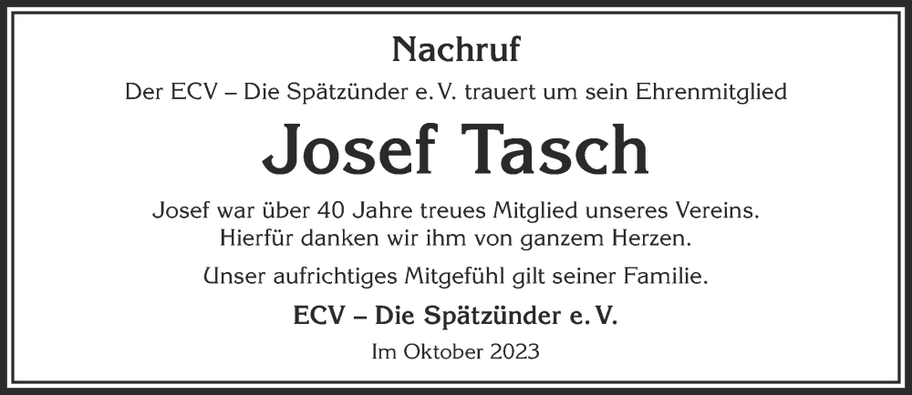 Hier finden Sie alle Traueranzeigen aus der Zeitung, die bisher für Josef Tasch erschienen sind. Weitere Traueranzeigen, die in der Zeitung erscheinen, werden hier ebenfalls aufgelistet