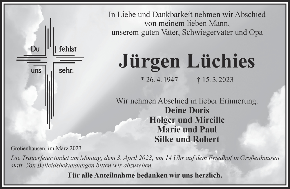 Hier finden Sie alle Traueranzeigen aus der Zeitung, die bisher für Jürgen Lüchies erschienen sind. Weitere Traueranzeigen, die in der Zeitung erscheinen, werden hier ebenfalls aufgelistet
