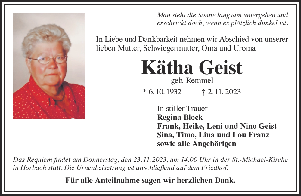 Hier finden Sie alle Traueranzeigen aus der Zeitung, die bisher für Kätha Geist erschienen sind. Weitere Traueranzeigen, die in der Zeitung erscheinen, werden hier ebenfalls aufgelistet